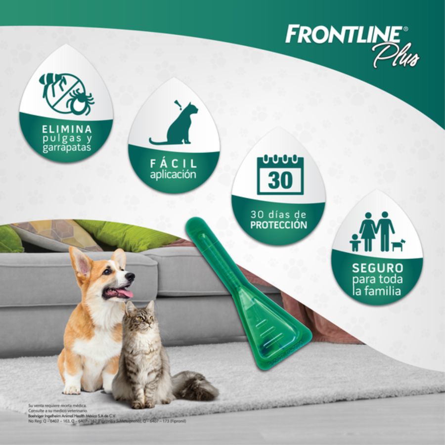 - Acerca del producto: <div id="producto-texto"><!--EDITAR--> <div style="text-align: justify;"><span style="font-size:12px;"><span style="font-family:arial,helvetica,sans-serif;"></span></span> <p>Cortar la pipeta a nivel de la parte superior marcada, vaciar el contenido de la misma directamente sobre la piel, separando el pelo del animal entre los hombros para evitar el lamido. Procurar no empapar el pelo con exceso, lo que podría darle un aspecto pegajoso en el foco de la aplicación. En caso de que ocurriera, el efecto desaparecerá a las 24 horas. FRONTLINE Plus puede utilizarse en hembras en gestación y en lactación, y en cachorros desde las 8 semanas de edad. El producto tarda 24 horas en extenderse por el pelo del animal. No se recomienda bañar al animal durante las 48 horas anteriores o posteriores a la aplicación de FRONTLINE Plus. Las garrapatas mueren durante las primeras 24-48 horas posteriores a su adhesión</p> <h4><strong>Presentaciones:</strong></h4> <ul> <li> 0,67 ML 2 – 10 KG</li> <li> 1,34 ML 10 – 20 KG</li> <li>2,68 ML 20 – 40 KG</li> <li>4,02 ML 40 – 60 KG</li> </ul> <h4><strong>*Aplícalo según el peso de tu perrito*</strong></h4> <span style="font-size:12px;"><span style="font-family:arial,helvetica,sans-serif;"></span></span></div> </div> <p> </p>